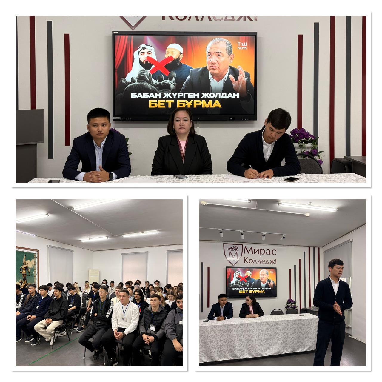 В учреждении колледжа «Мирас» в рамках профилактической работы среди несовершеннолетних в Туранском районе было проведено мероприятие, направленное на предупреждение правонарушений, наркомании, суицида, ранней беременности среди девушек, торговли людьми, деструктивных религиозных течений и семейно-бытового насилия, а также на разъяснение антикоррупционных мер. В рамках тем «Ырыс алды ынтымақ» и «Воспитаем достойное поколение» состоялась встреча со студентами.