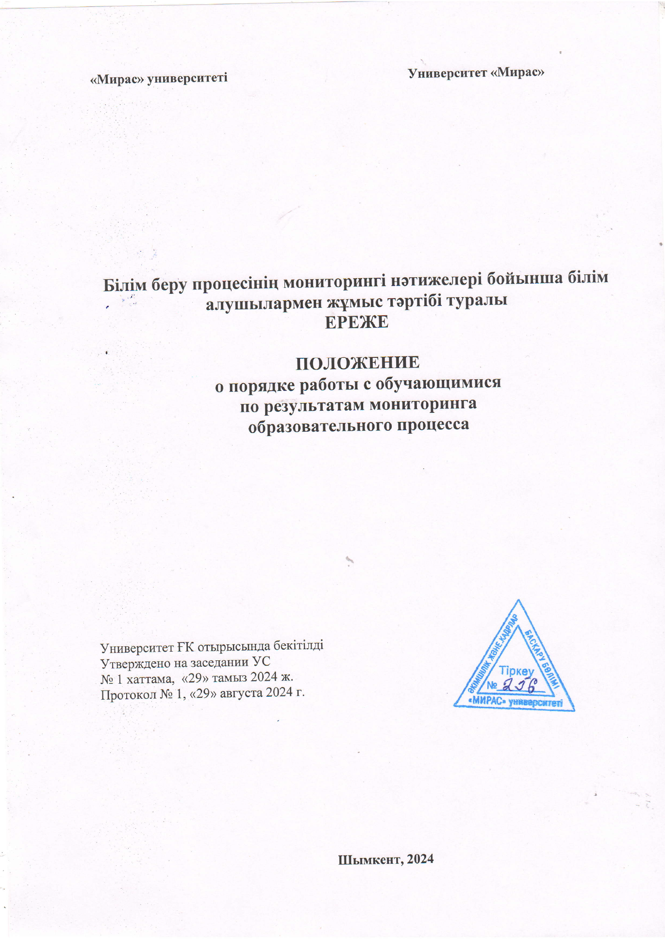 1.1. Настоящее Положение определяет порядок организации и осуществления работы с обучающимися Университета «Мирас» по итогам мониторинга: