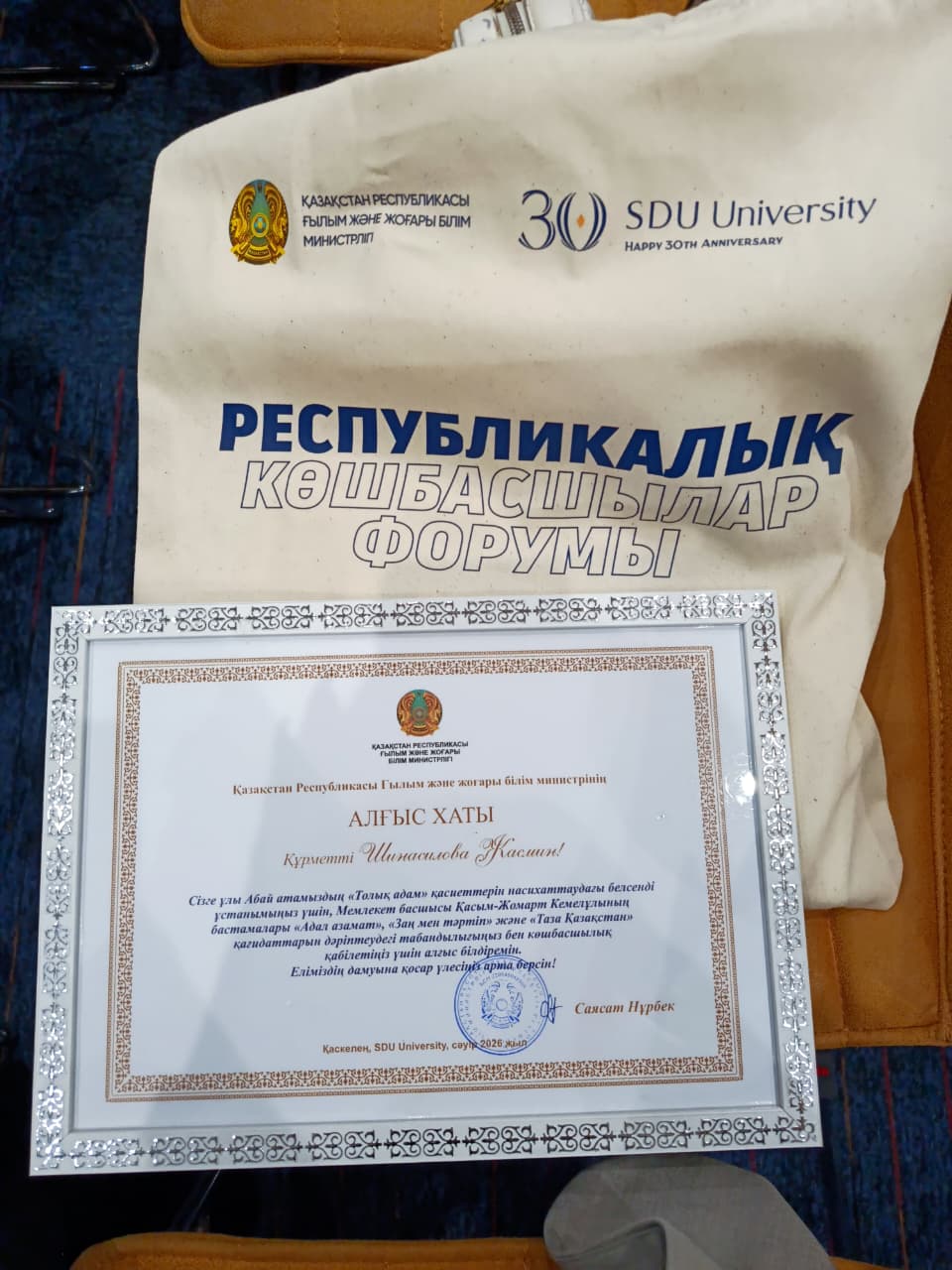 От университета «Мирас» в форуме приняла участие студенческий омбудсмен Шинасилова Жасмин Алексеевна. По итогам мероприятия она была награждена благодарственным письмом от Министра науки и высшего образования Республики Казахстан Саясат Нурбека за активную позицию, вклад в продвижение ценностей «Толық адам» Абая Кунанбаева, а также за участие в реализации инициатив «Адал азамат», «Закон и порядок» и «Таза Қазақстан».