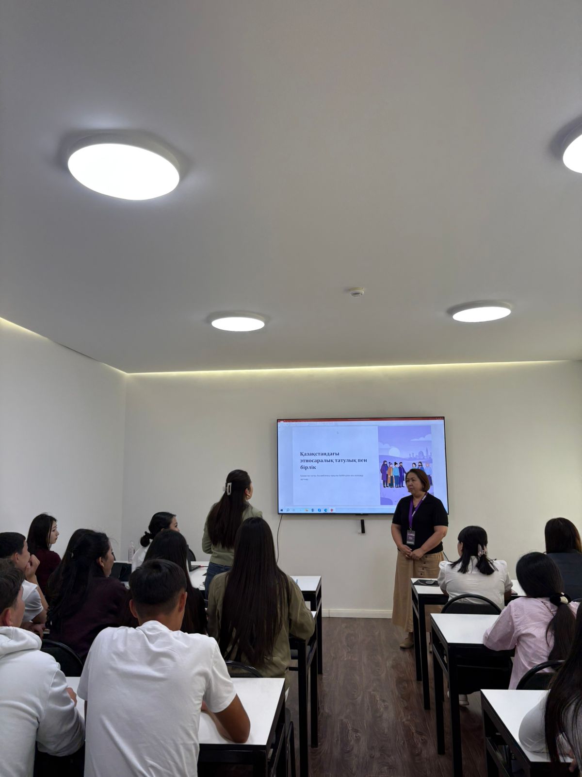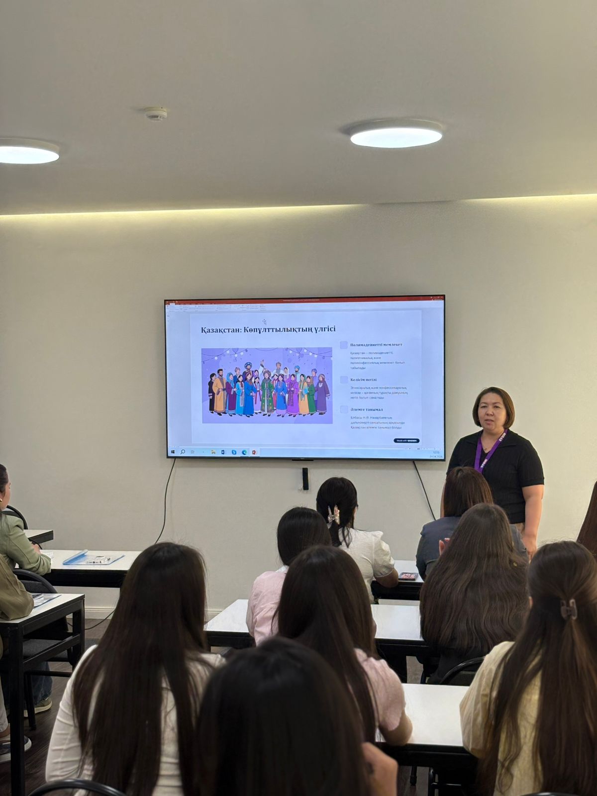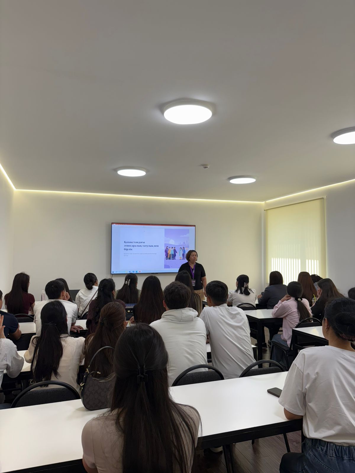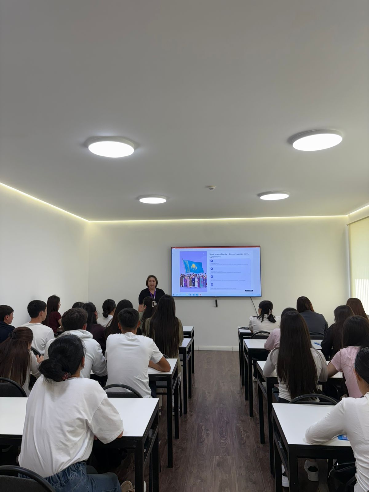 28.04.2026 старший преподаватель сектора иностранных языков университета Мирас Комекбаева Л.М. провела беседу на тему «Этносоциальное согласие и единство в Казахстане: укрепление мира и согласия через Ассамблея народа Казахстана» для студентов 1 курса.