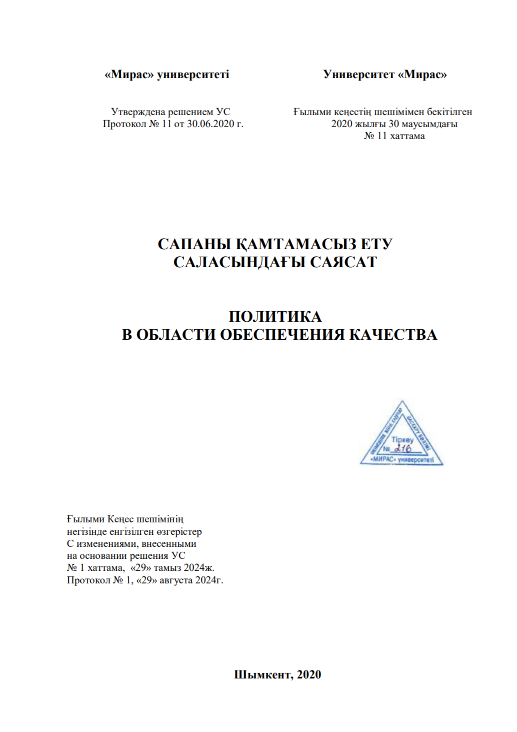 Политика в области обеспечения качества является собственностью университета «Мирас» и предназначе на для внутреннего пользования в деятельности Университета.