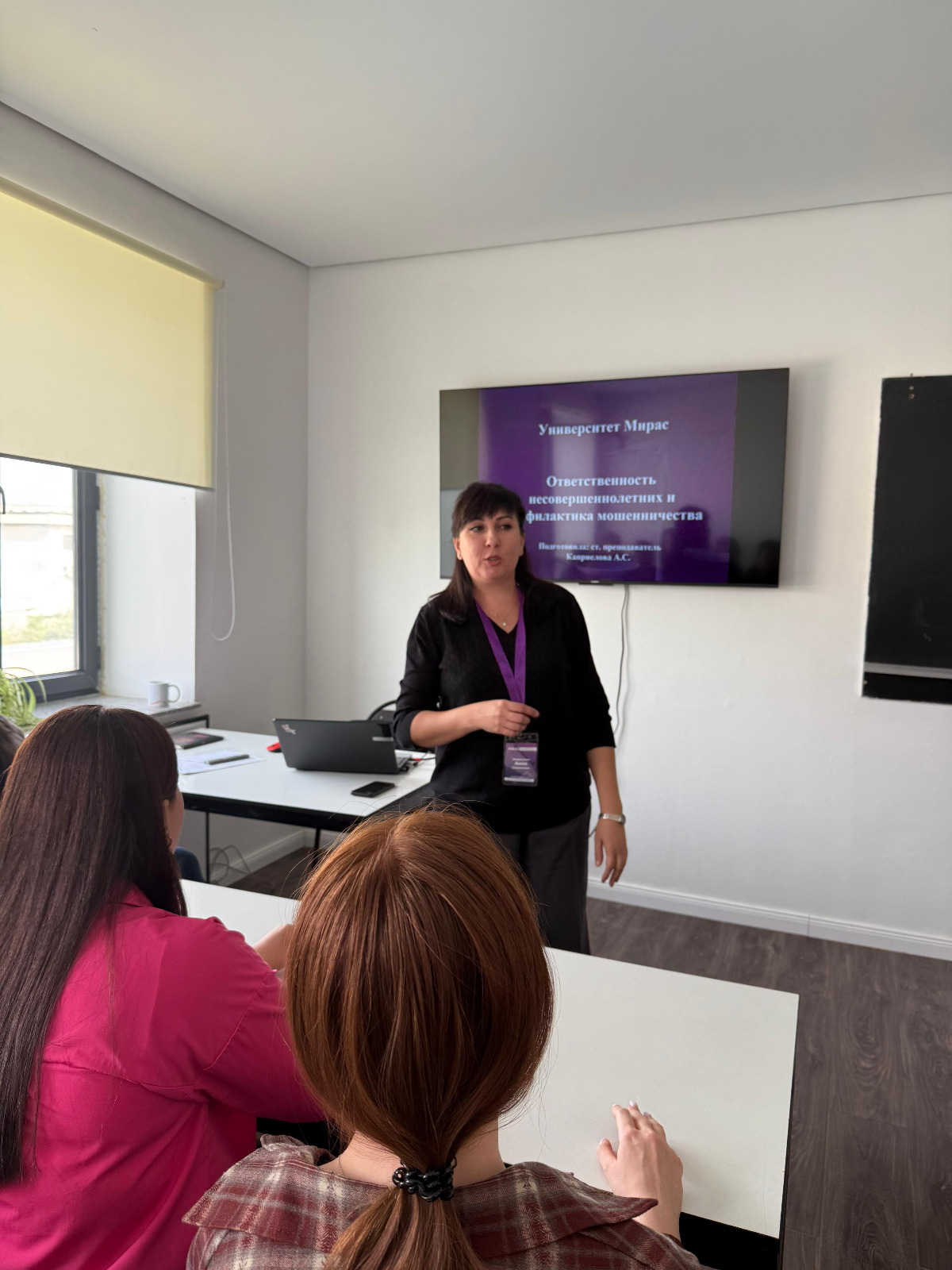 23.09.2025 старший преподаватель сектора Иностранных языков университета Мирас Каприелова А.С. провела беседу на тему «Ответственность несовершеннолетних и профилактика мошенничества» для студентов 1 курса.