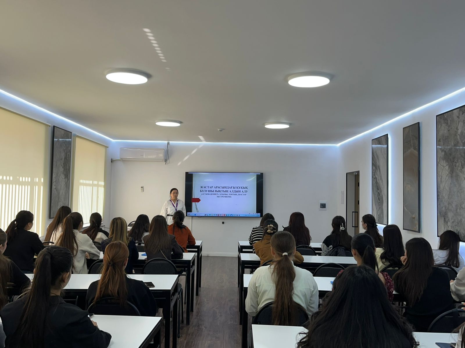 15.10.2025 года старший преподаватель сектора педагогики и психологии университета «Мирас» Утеева Г. Т. провела открытый тематический час на тему: «Профилактика правонарушений среди молодежи (понятие «субкультуры», группового, молодежного экстремизма».