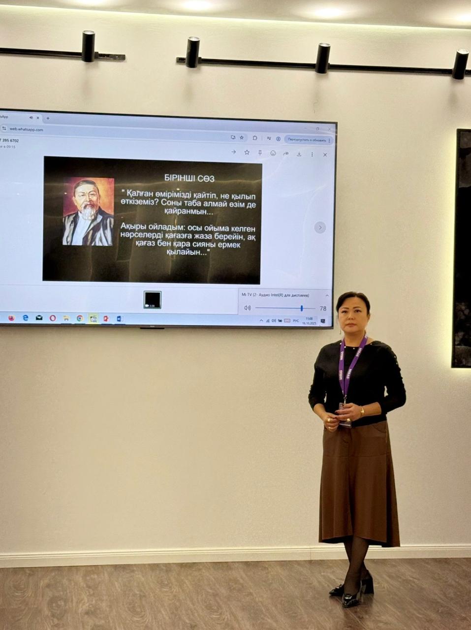 В рамках занятия обучающиеся познакомились с биографией и творческим наследием Абая Кунанбаева, осмыслили философскую глубину его произведений, проанализировали нравственные и гуманистические идеи, выраженные в стихах и пословицах. Особое внимание было уделено тому, что взгляды Абая на образование, науку, труд и мораль остаются актуальными и сегодня, формируя духовный ориентир для молодёжи.