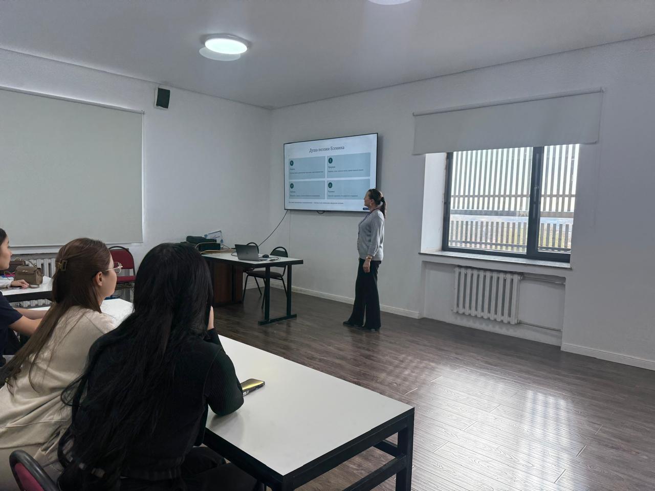 05.11.2025 г. в группе РЛ-2511р-1 старший преподаватель сектора языков и литературы Кожахметова С.Н. провела кураторский час, посвящённый теме «130 лет со дня рождения русского поэта С.Есенина (1895–1925 г.)». Куратор начала встречу с краткого рассказа о значении творчества Есенина для отечественной культуры и отметил, что в 2025 году отмечается 130-летие со дня рождения поэта. Было показано видео-презентация «Сергей Есенин — певец русской души», в которой прозвучали стихи поэта в исполнении известных актёров и студентов группы.
