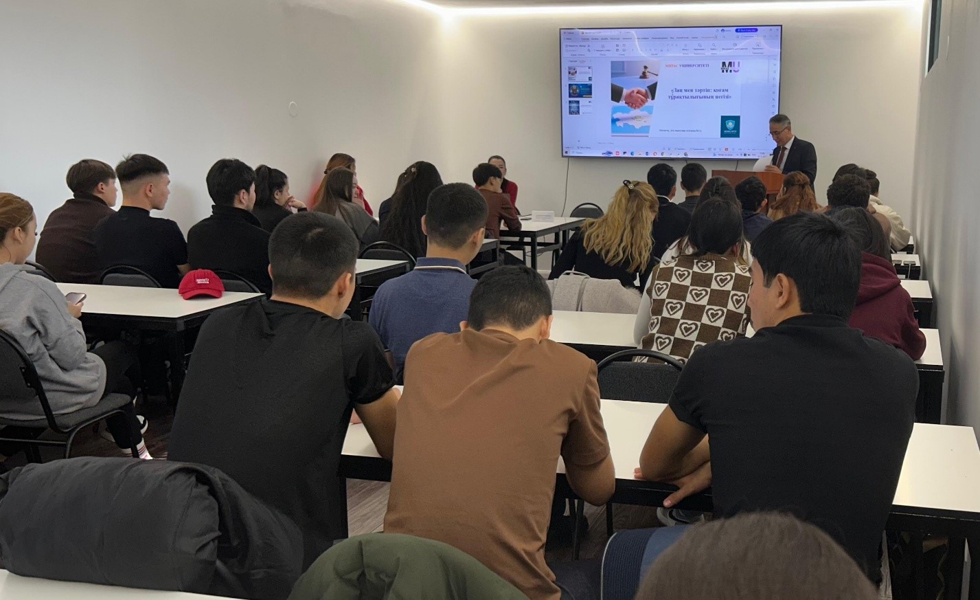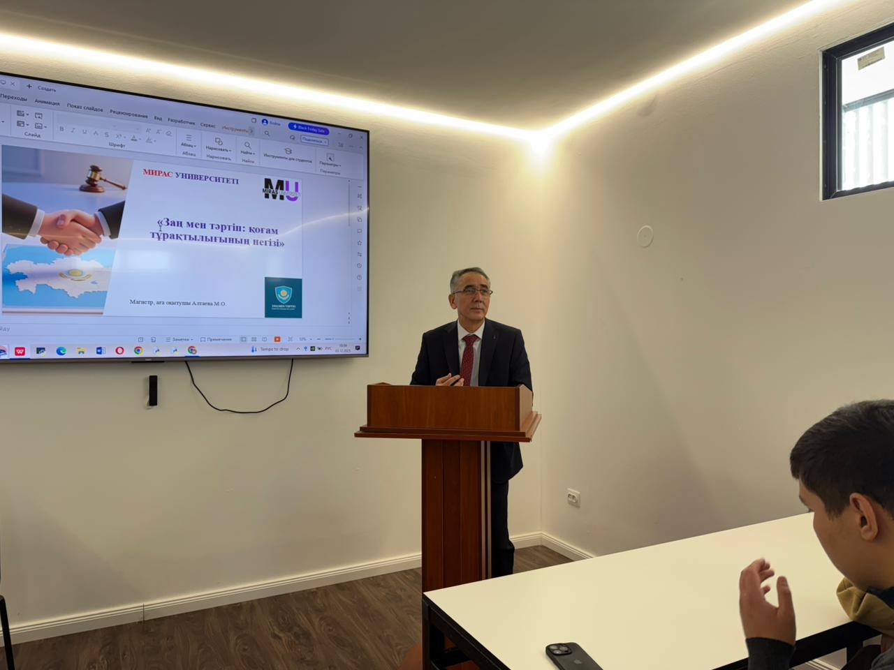 03 декабря 2025 года в университете «Мирас» была проведена встреча с судьёй межрайонного суда по гражданским делам города Шымкент Отарбаевым Еркеном Бостанбекұлы на тему: «Закон и порядок: основа стабильности общества».