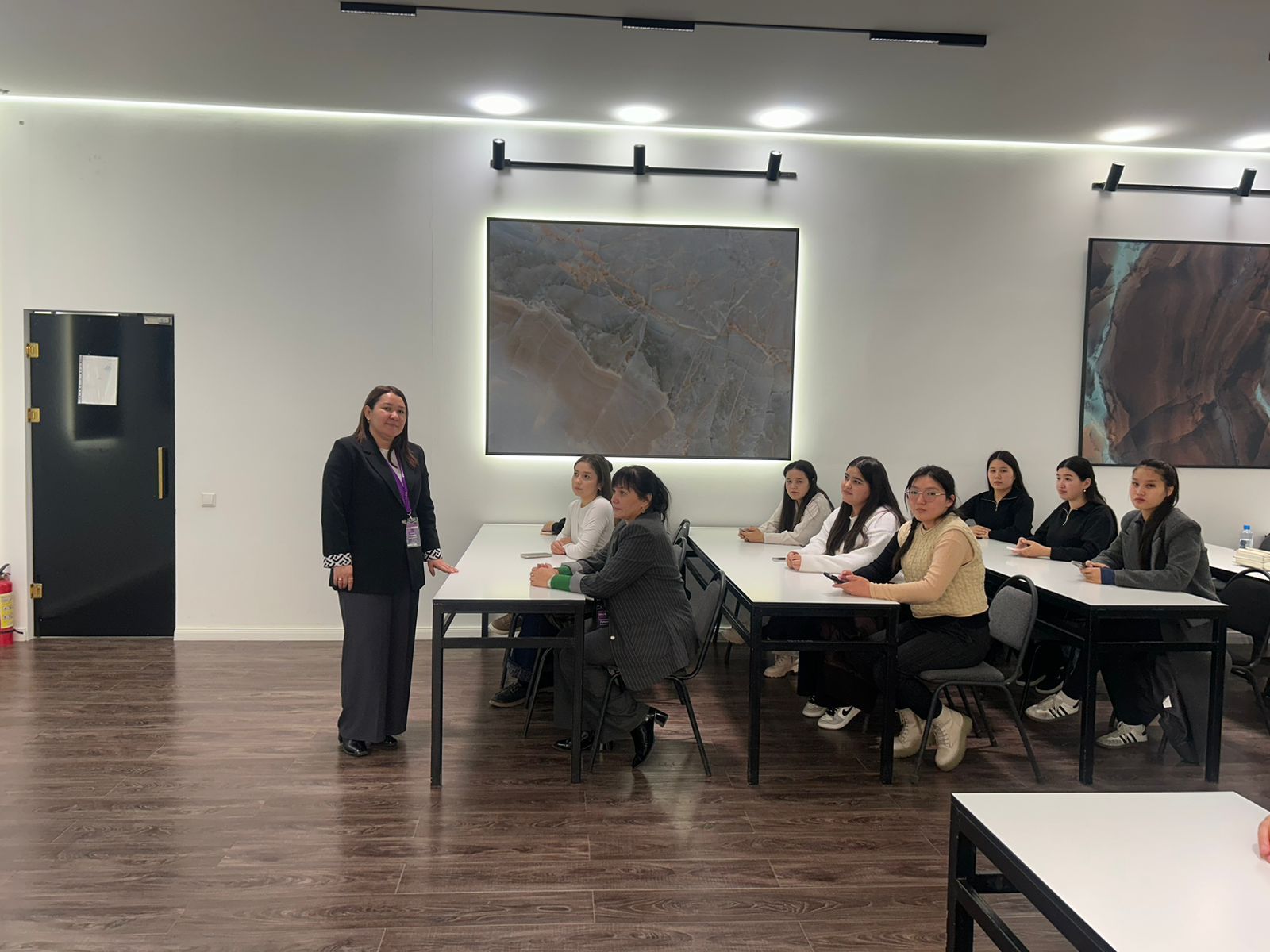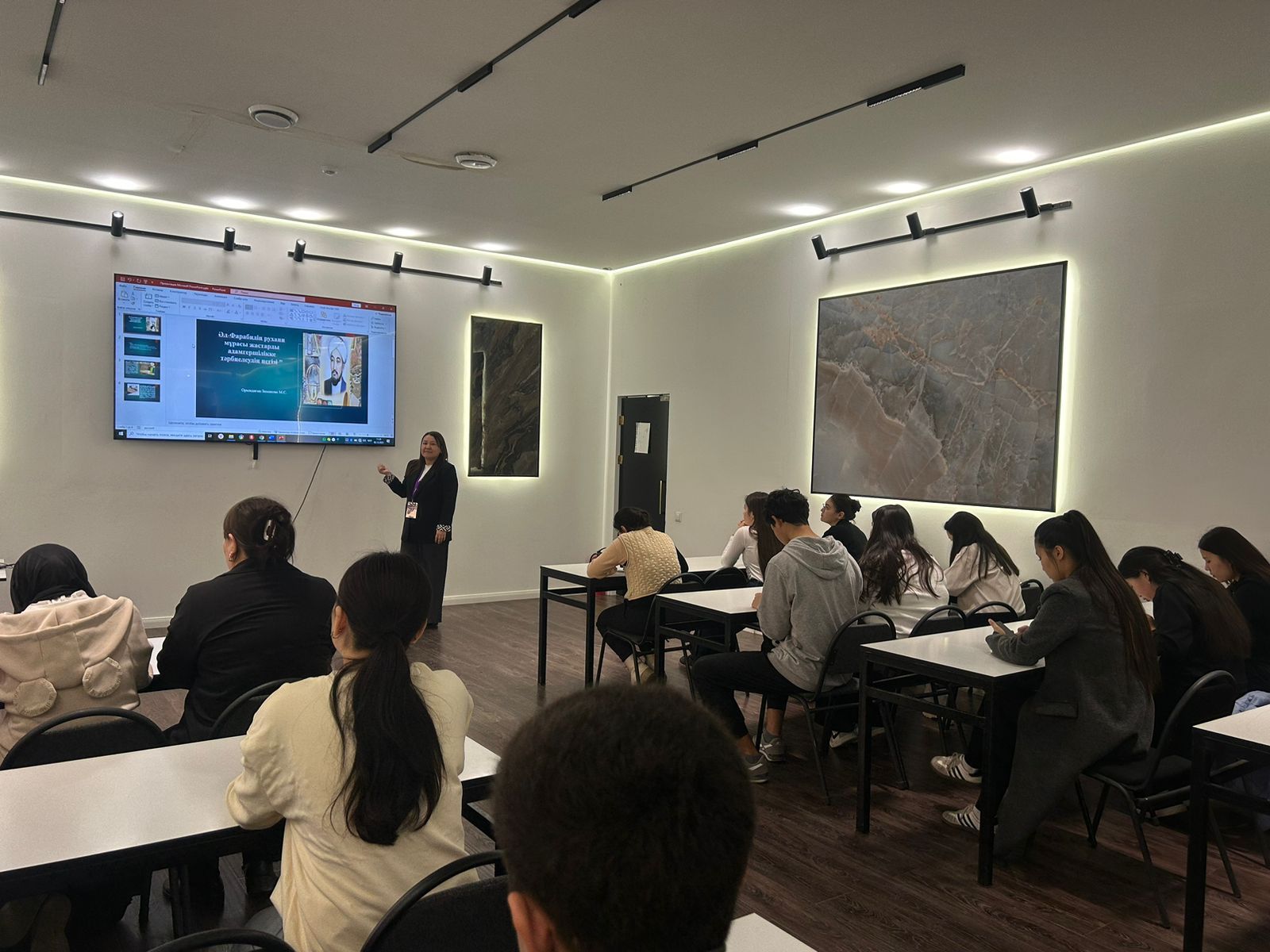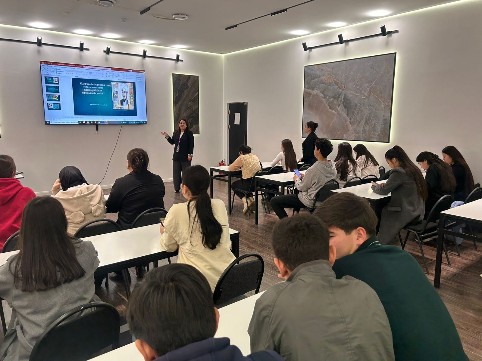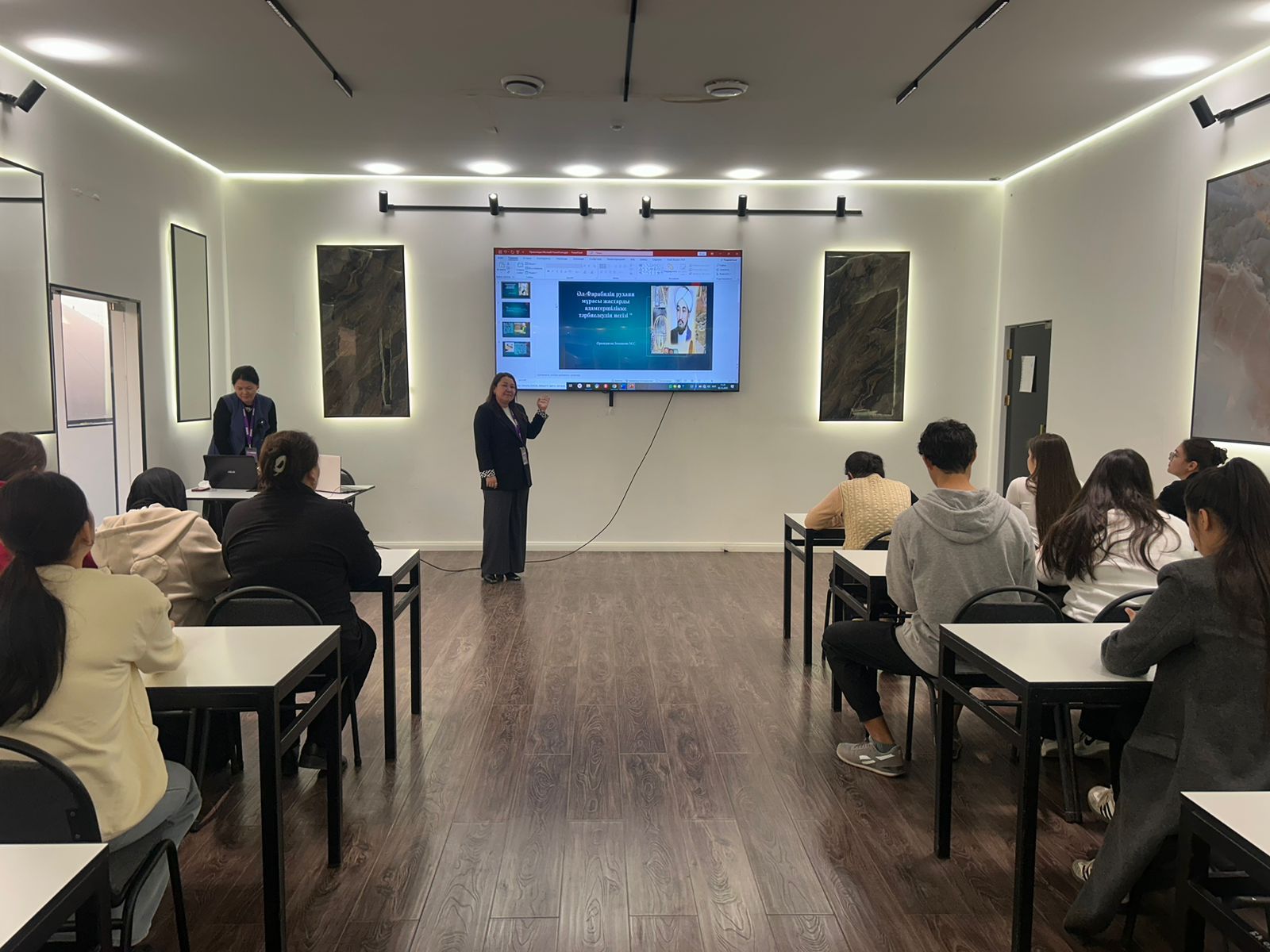 05.12.2025 г. магистр, преподаватель сектора педагогики и психологии Замановa М.С. совместно с обучающимися провела открытый тематический час на тему: «Духовное наследие Аль-Фараби — основа воспитания молодежи в духе нравственности».