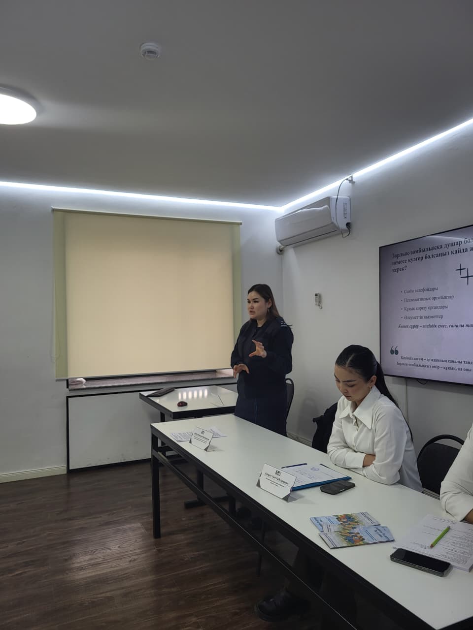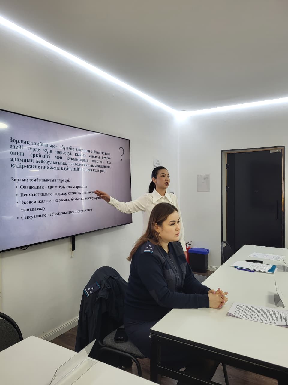 В мероприятии приняли участие специалисты: психолог отдела психологической помощи Конрат Умит Кайсаркызы и инспектор по агитационно-разъяснительной работе Управления общественной безопасности Департамента полиции города Шымкента Абай Айганым Мухтаркызы, которые дали разъяснения, практические рекомендации и ответили на вопросы студентов.