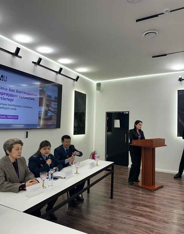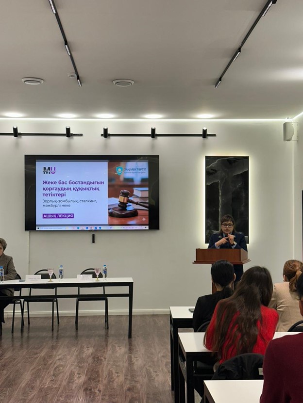 11 февраля 2026 года в университете «Мирас» состоялась открытая лекция на тему: «Правовые механизмы защиты личной свободы: насилие, сталкинг, принудительный брак». В мероприятии приняли участие преподаватели и обучающиеся университета, а также инспектор отдела по борьбе с семейно-бытовым насилием управления общественной безопасности департамента полиции города Шымкента Сахибекова Диана Асановна.