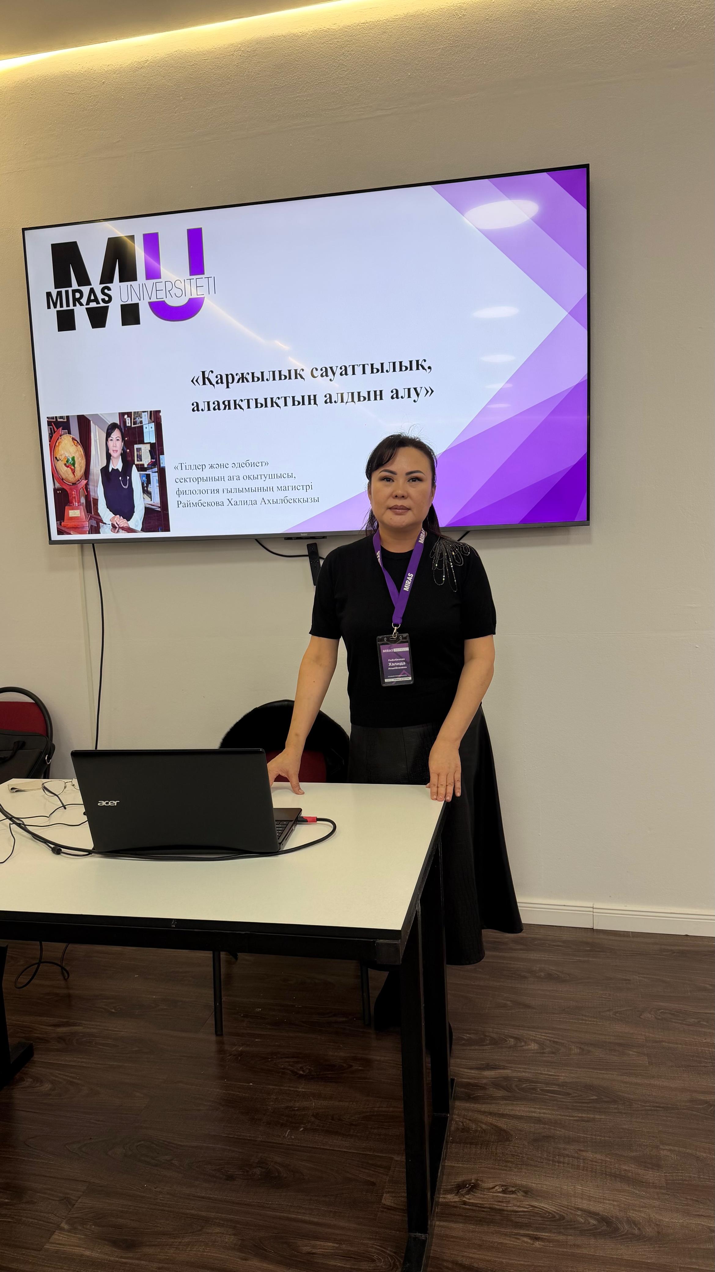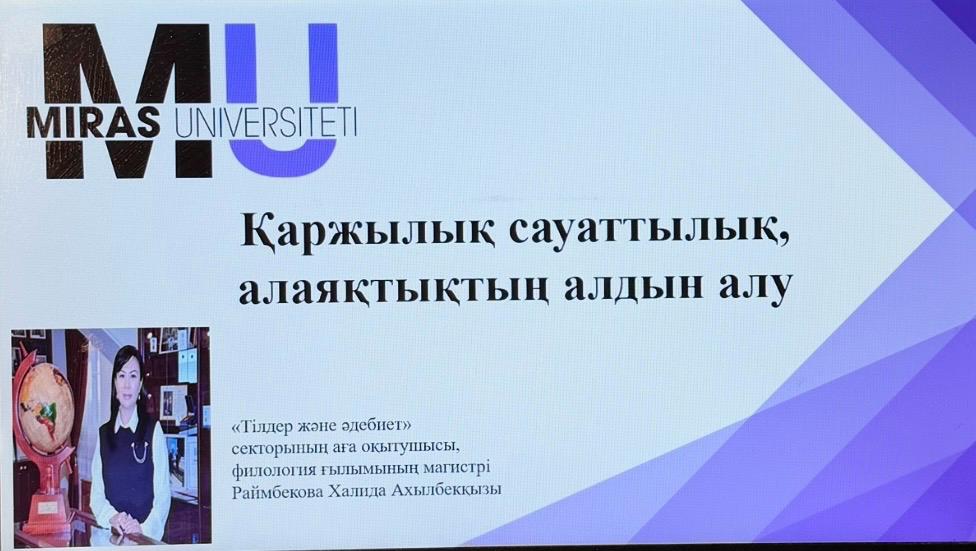 19 февраля 2026 года руководитель группы, директор ТОО «Askar Corporation» Раймбекова Халида Ахылбеккизы провела разъяснительную работу по финансовой грамотности для студентов сектора языков и литературы Университета «Мирас» на тему «Финансовая грамотность, предотвращение мошенничества».