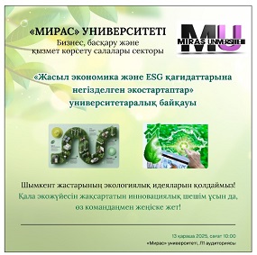 С целью развития экологической культуры на основе принципов «Зелёной экономики» и ESG, поддержки студенческих инициатив по охране природы и формирования эффективной модели экологических стартапов в городе Шымкент, сектор бизнеса, управления и сферы услуг «Мирас» университета 13 ноября 2025 года провёл среди молодежи города межуниверситетский конкурс «Экостартапы на основе принципов «Зелёной экономики» и ESG». Конкурс был направлен на разработку инновационных и современных экостартап-проектов, способствующих повышению культуры сознательного потребления и решению проблем городской экосистемы. Проект способствует укреплению экологической устойчивости города Шымкент, повышению уровня экологической культуры и социальной ответственности в обществе. Кроме того, инициатива предоставляет молодежи отличную возможность проявить активность в общественной жизни и реализовать свои творческие идеи.