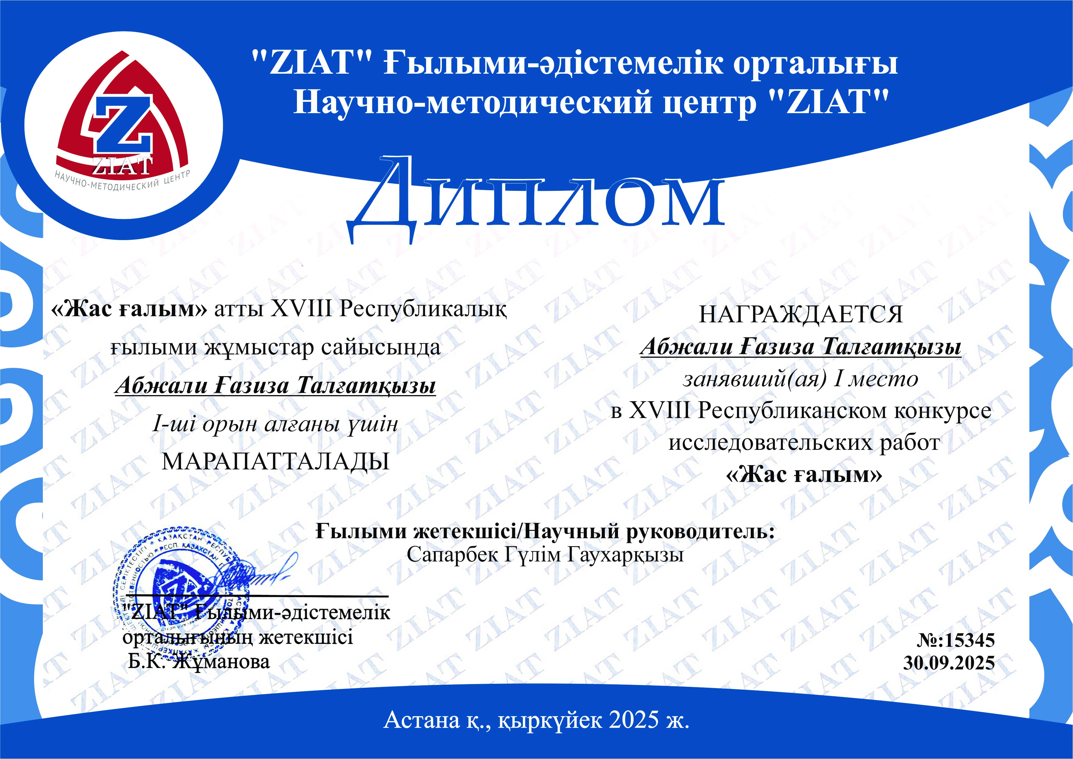 19 работ были направлены для участия в XVIII Республиканском конкурсе исследовательских работ «Жас ғалым» (г. Астана, научно-методический центр «ZIAT», 30.09.2025):