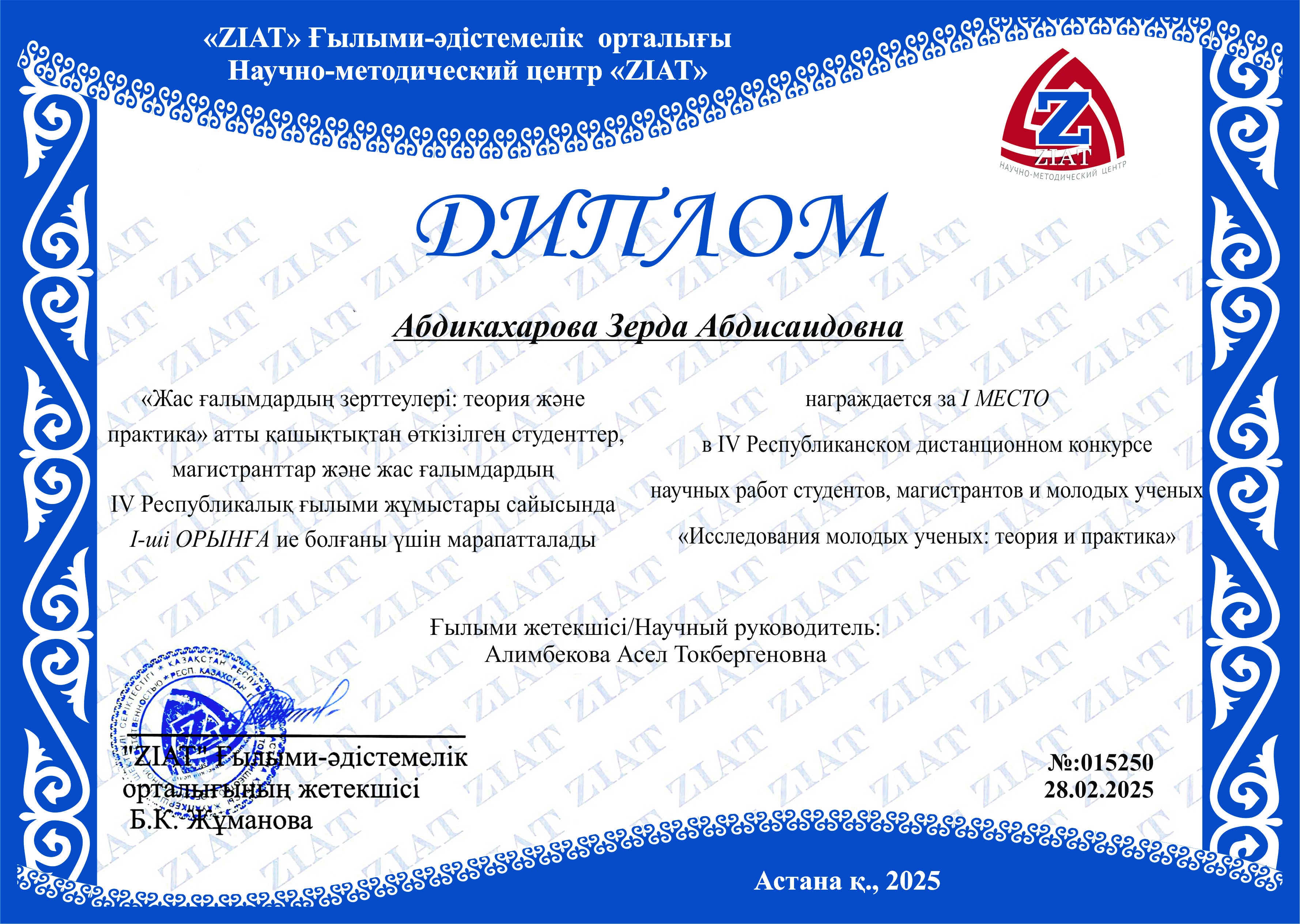 21 работа была направлена для участия в IV Республиканском конкурсе научных работ студентов, магистрантов и молодых ученых «Исследования молодых ученых: теория и практика» (г. Астана, научно-методический центр «ZIAT», 28.02.2025):