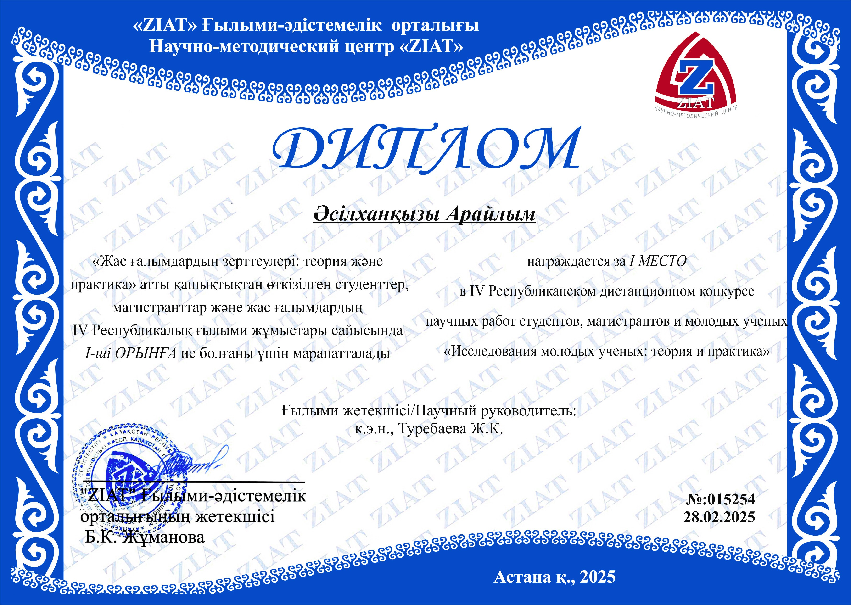 - Қойшыман М.К. – 2 курс, научный руководитель – Манабаева С.Е. № 013395, 30.03.2021 – диплом 1 место.